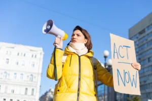 Female demonstrating board with protest against pandemic, political or environmental issues. single protest.