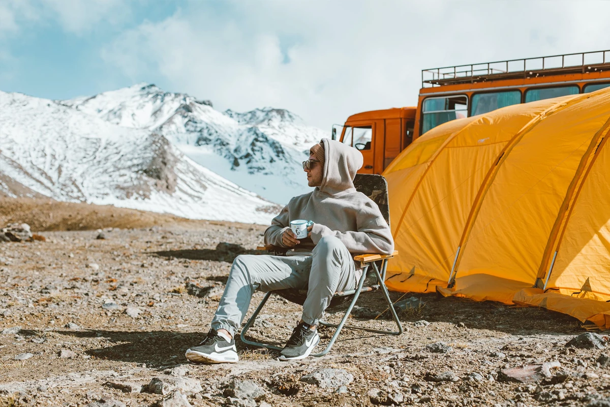 Camping with Tents Around Campfire with Mountain Peak in Background